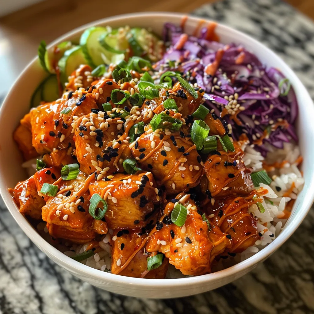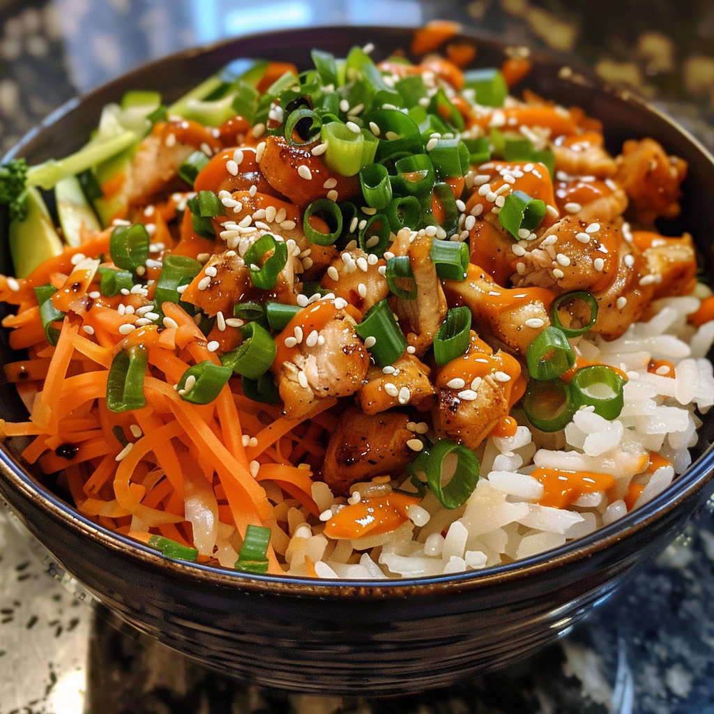 Assemble the bowls by layering rice on the bottom, followed by sauced chicken. Top with cucumber slices, shredded carrots, chopped green onions, and a sprinkle of sesame seeds. Serve immediately while warm.