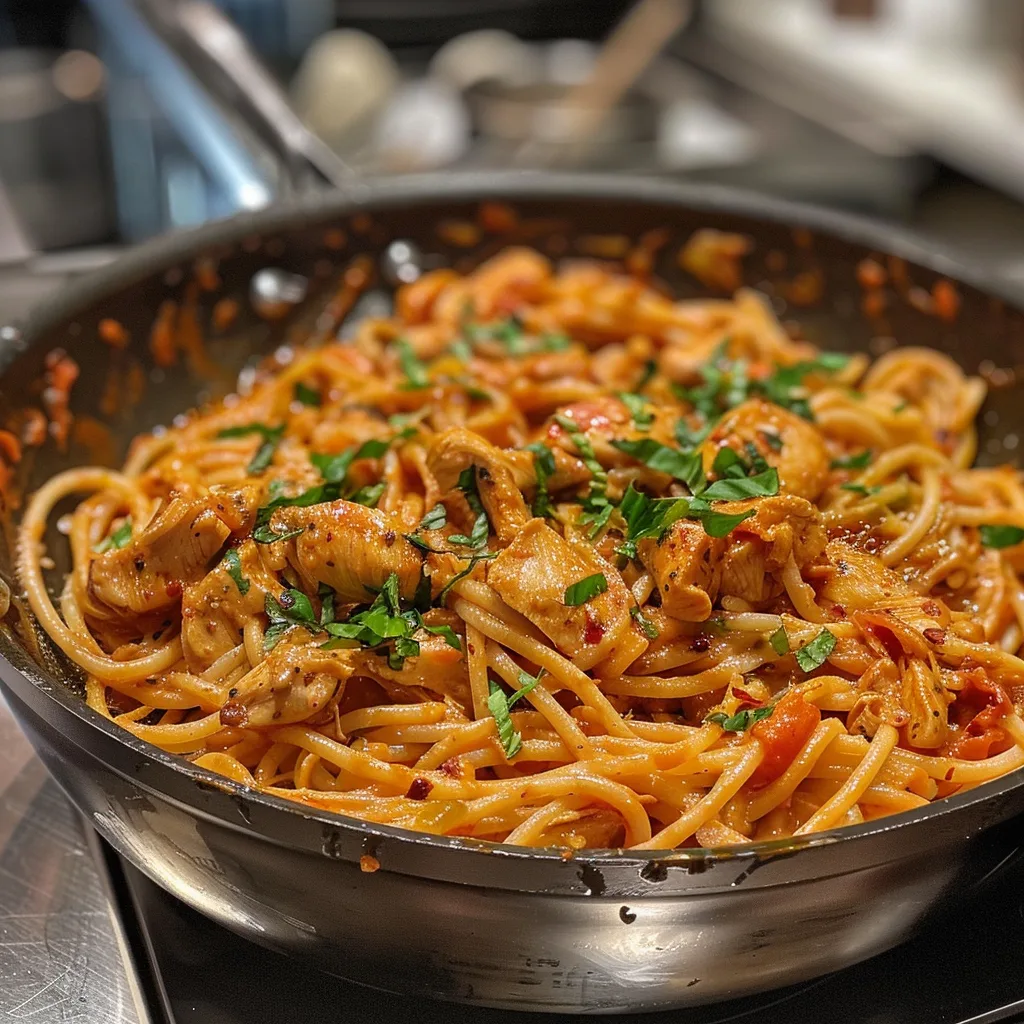 Meanwhile, cook spaghetti according to package instructions until al dente. Drain, reserving ½ cup of pasta water. Add the cooked spaghetti to the sauce along with the chicken, tossing everything together. If needed, add a splash of pasta water to loosen the sauce. Finish with a squeeze of lemon juice and garnish with chopped parsley. Serve hot, topped with extra Parmesan and a sprinkle of Cajun seasoning.