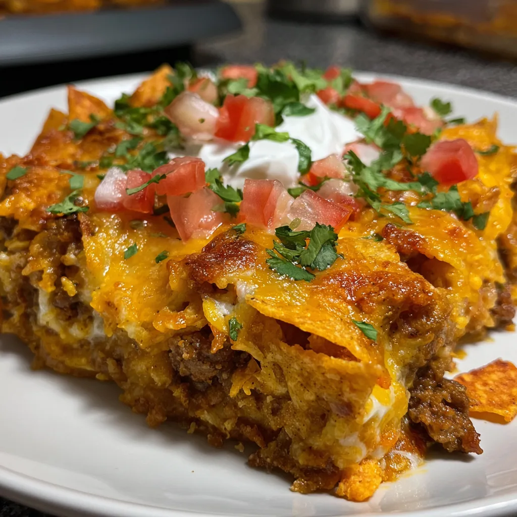 A fun, bold, and cheesy Dorito Taco Casserole made with seasoned ground beef, crunchy Doritos, melted cheese, and classic taco flavors—perfect for family dinners or potlucks.