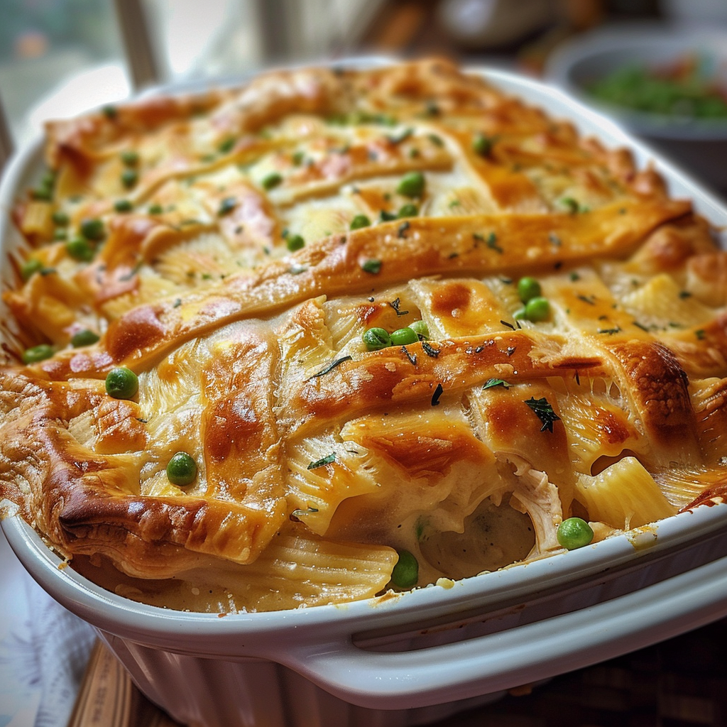 A creamy and comforting pasta dish inspired by classic chicken pot pie, made with tender chicken, vegetables, and a rich sauce tossed with pasta.