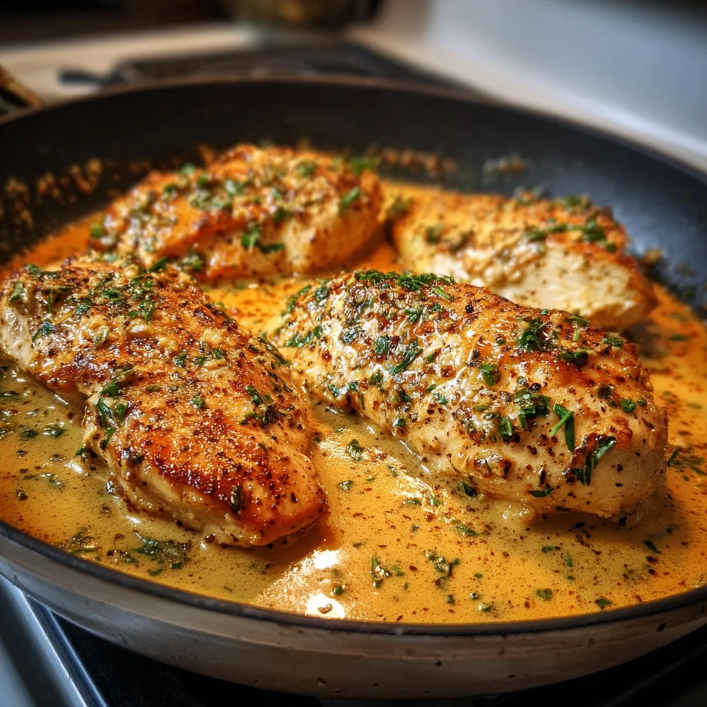 Return the chicken to the pan, spooning the creamy sauce over each piece. Simmer for another 3–5 minutes to allow the flavors to meld. Garnish with fresh parsley before serving. Serve hot with pasta, rice, or roasted vegetables for a complete meal.