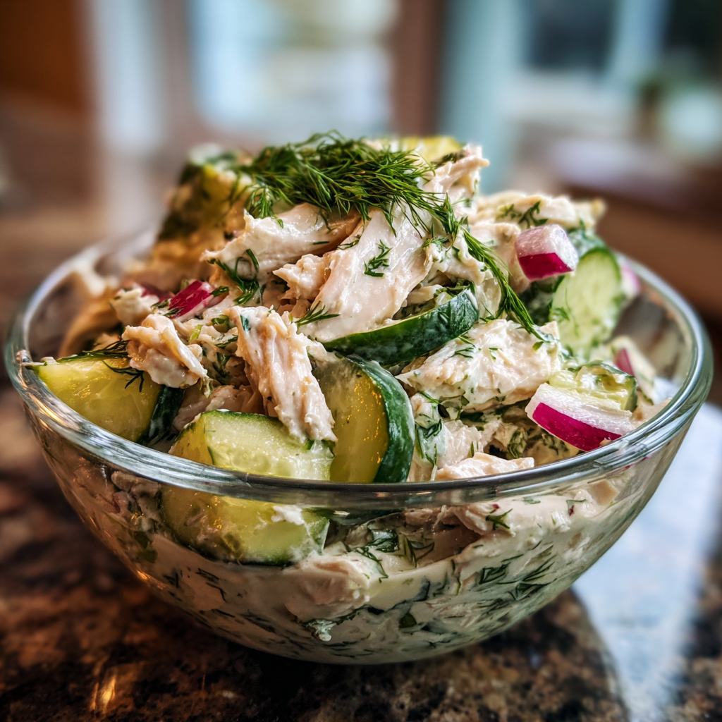 A crunchy dill pickle chicken salad made with tender chicken, crisp pickles, celery, and a creamy, tangy dressing perfect for sandwiches or low-carb bowls.