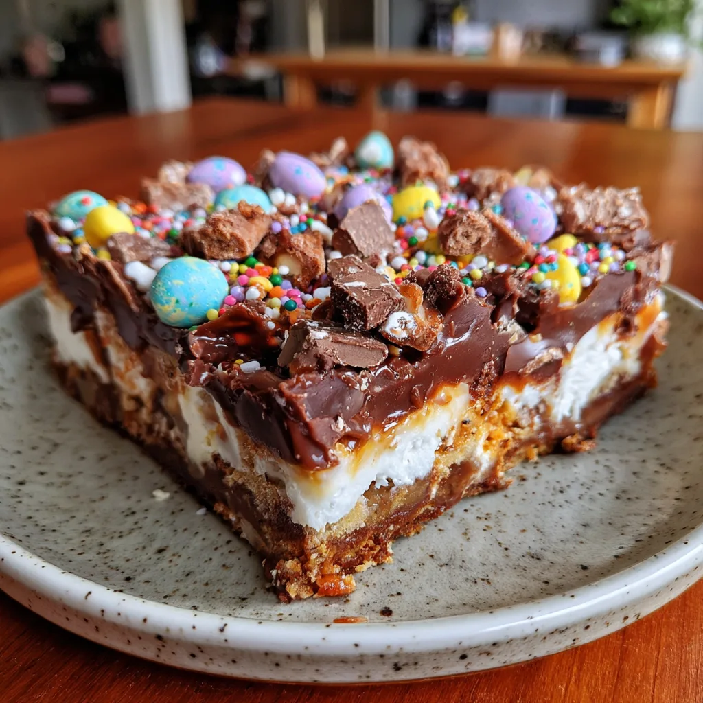 A festive no-bake Easter Rocky Road Slice loaded with chocolate, marshmallows, crunchy biscuits, and colorful mini eggs. This easy treat is rich, chewy, and perfect for holiday celebrations.