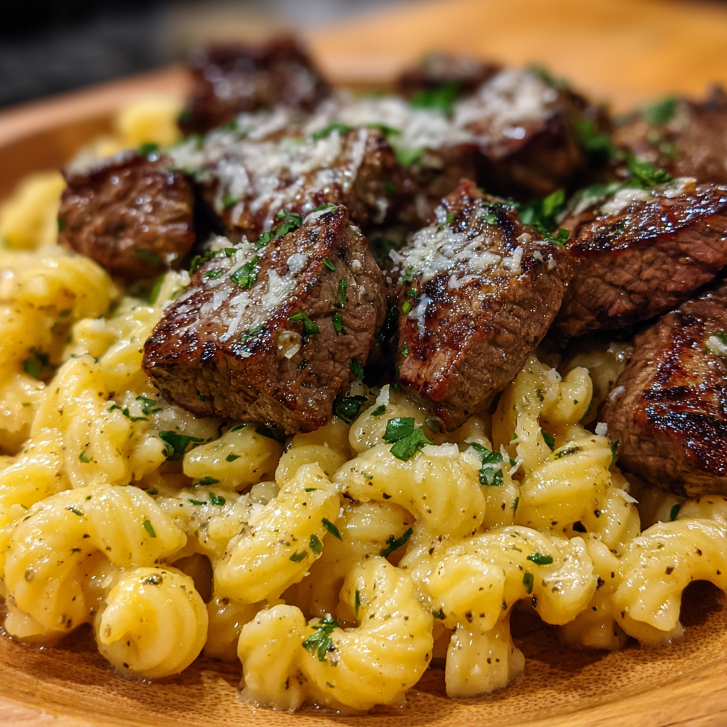 Juicy garlic butter steak bites served over creamy Parmesan pasta, combining tender beef with a rich, velvety sauce for a satisfying restaurant-style meal at home.