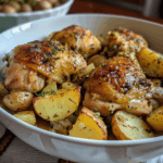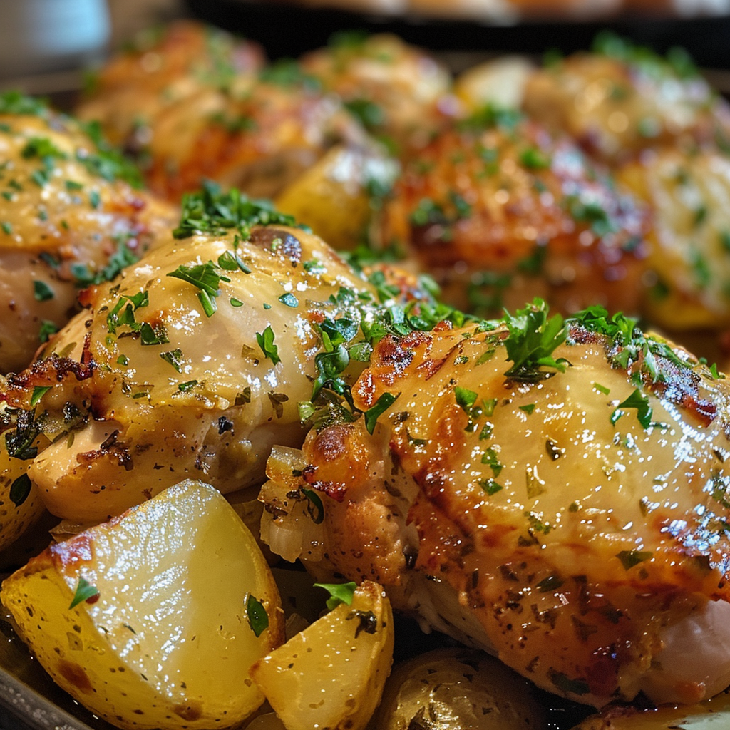 - Pour the mixture evenly over the chicken and potatoes, making sure everything is coated.