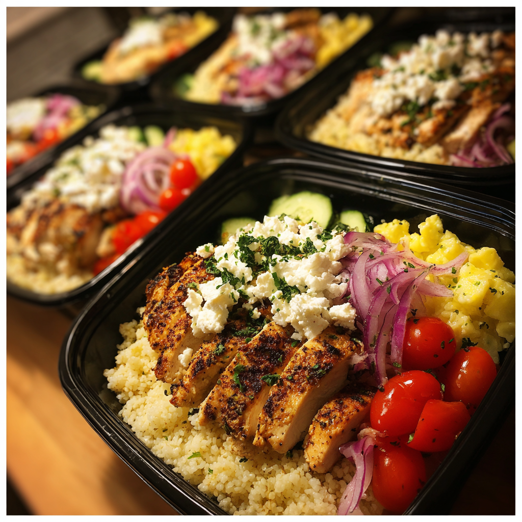 To assemble, divide the grain base into bowls or meal prep containers. Top with sliced chicken, cherry tomatoes, cucumber, red onion, olives, and feta cheese. Garnish with fresh parsley. Serve immediately or store for later.