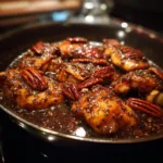This recipe balances bold and comforting flavors perfectly. The bourbon adds depth and smokiness, while the maple syrup brings sweetness that caramelizes beautifully as it cooks. The pecans lend texture and a nutty contrast to the tender chicken, making every bite delightful. It’s a quick, skillet-friendly recipe that looks and tastes restaurant-worthy but uses simple ingredients you likely already have.