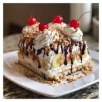No-bake banana split cake is a creamy, layered dessert inspired by the classic banana split, featuring a graham cracker crust, banana layer, pineapple, cheesecake filling, and whipped topping.