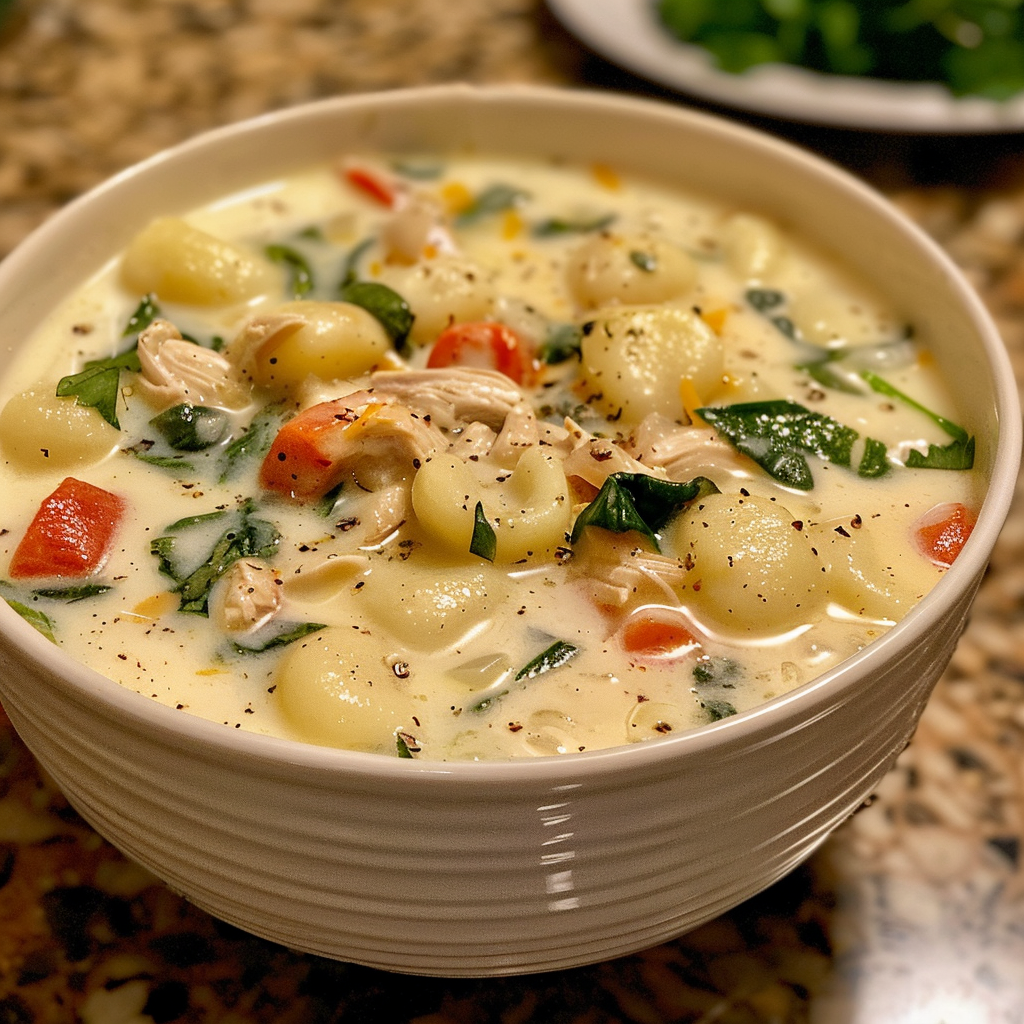A creamy and comforting soup inspired by Olive Garden, made with tender chicken, pillowy gnocchi, spinach, carrots, and a rich broth.