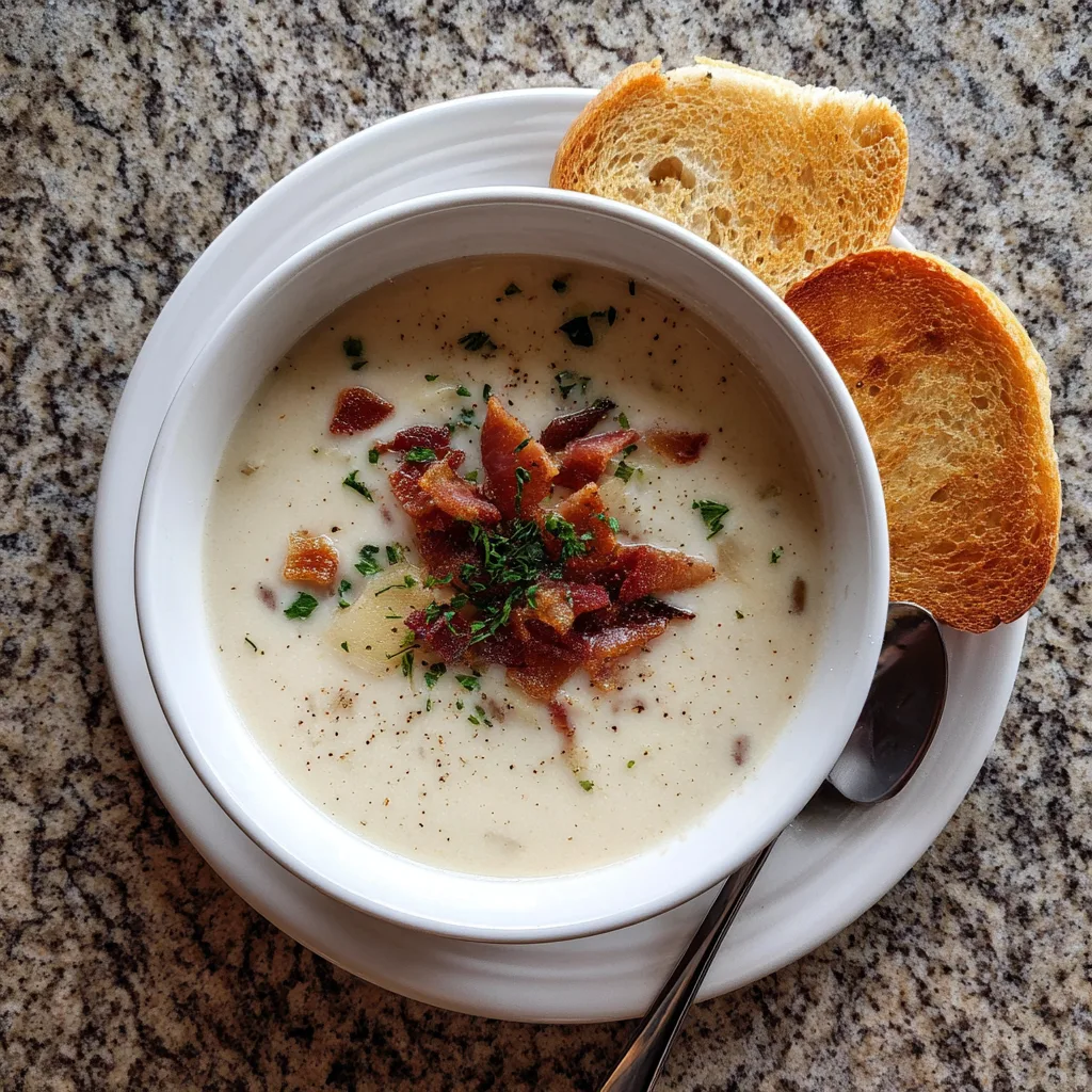 - Ladle into bowls and top with crumbled bacon, green onions, and extra cheese if desired.