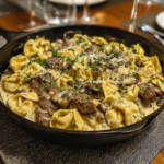 Skillet Beef Stroganoff Tortellini in Creamy Parmesan Sauce is a cozy, satisfying dish that brings together classic comfort flavors in a simple, modern way. I created this recipe on a night when I wanted the richness of traditional beef stroganoff but with less time and fewer dishes. Swapping egg noodles for tender cheese tortellini instantly made the meal feel more indulgent, while keeping everything in one skillet made it weeknight-friendly. The beef is savory and hearty, the sauce is creamy without being heavy, and the Parmesan adds a deep, nutty finish that ties everything together beautifully. What I love most about this recipe is how quickly it comes together while still tasting like something that simmered all day. It is perfect for busy evenings, family dinners, or anytime you crave something warm, creamy, and deeply comforting.