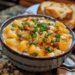 Slow Cooker Potato Soup is a creamy, hearty comfort food classic made effortlessly in the crockpot. Filled with tender potatoes, onions, and savory seasonings, it’s blended to silky perfection and finished with cheese, bacon, and chives for the ultimate cozy meal.