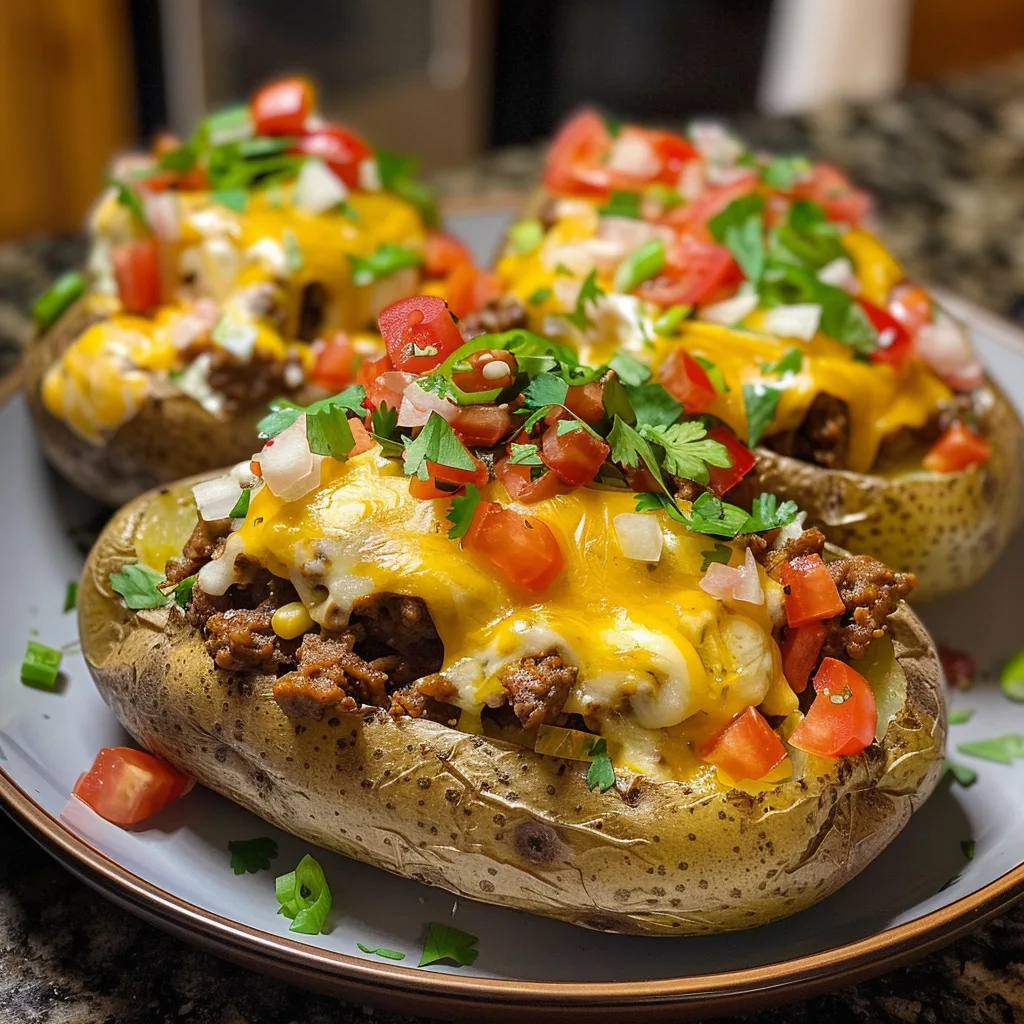 Fluffy baked potatoes stuffed with seasoned taco meat, cheese, and your favorite toppings for a fun Tex-Mex twist on a classic comfort food.